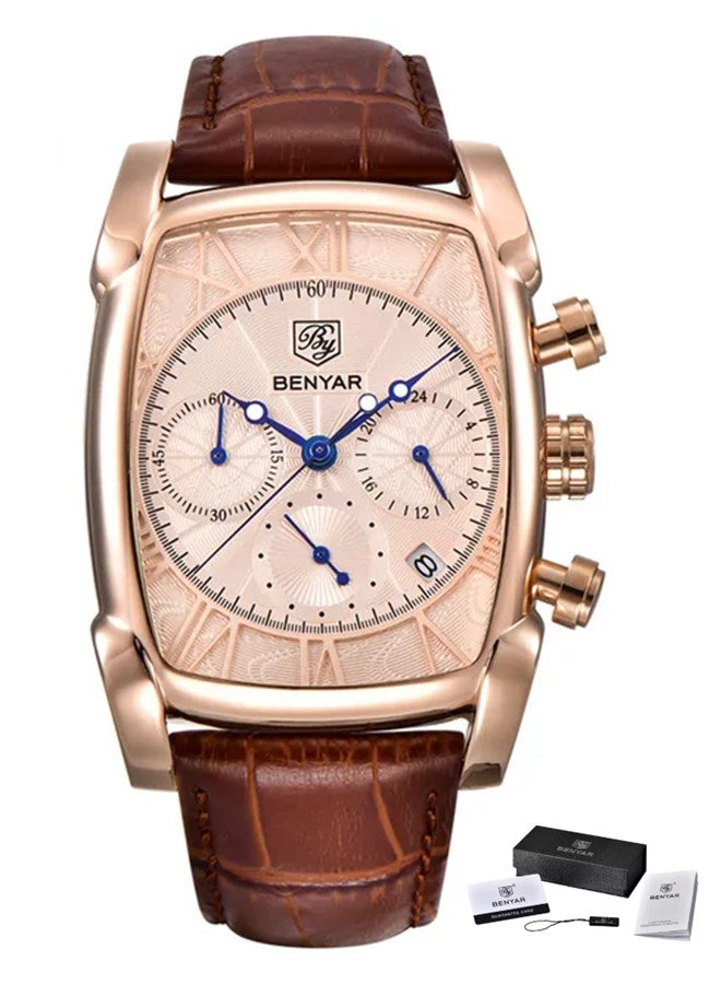 Introducing the BENYAR BY-5114 – a rectangle-shaped timepiece that fuses vintage elegance with modern craftsmanship. Designed for the man who values form and function, this analog quartz watch features a Roman numeral dial, smooth small seconds sub-dial, and a date window—all encased in a bold alloy frame. With a mineral glass window, soft leather strap, and waterproof design (30M), it's made for both casual and business occasions. The brown and black variants add a refined finish, offering timeless wristwear that commands attention. Ideal for men who prefer watches that don’t just tell time—but tell a story.