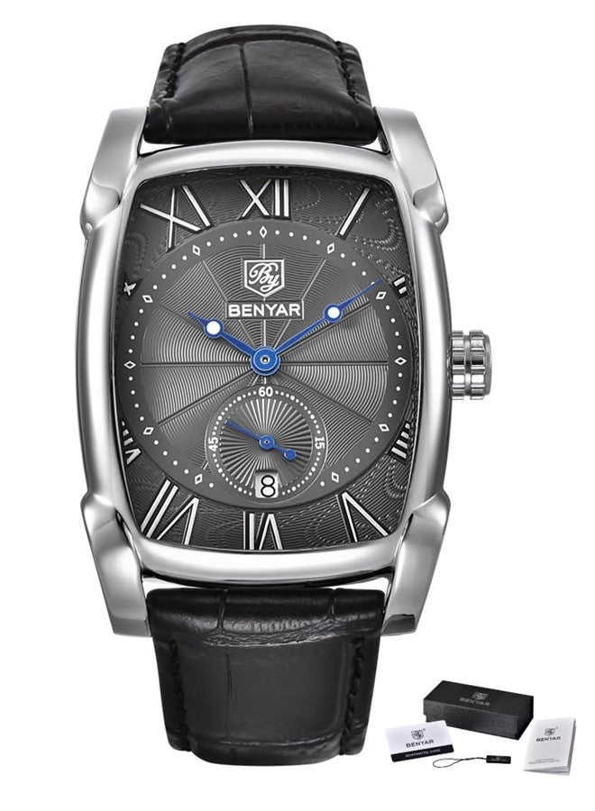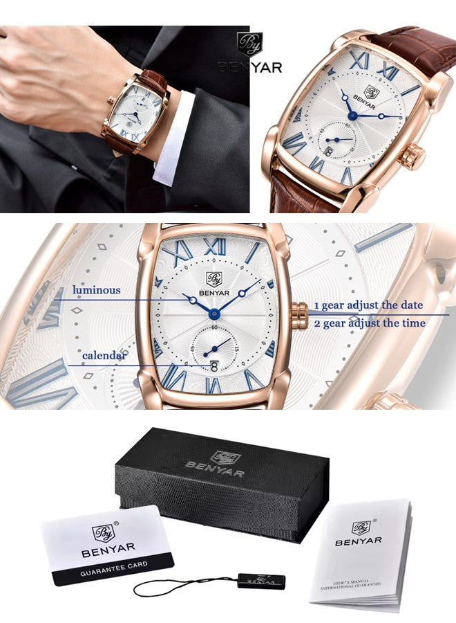 Introducing the BENYAR BY-5114 – a rectangle-shaped timepiece that fuses vintage elegance with modern craftsmanship. Designed for the man who values form and function, this analog quartz watch features a Roman numeral dial, smooth small seconds sub-dial, and a date window—all encased in a bold alloy frame. With a mineral glass window, soft leather strap, and waterproof design (30M), it's made for both casual and business occasions. The brown and black variants add a refined finish, offering timeless wristwear that commands attention. Ideal for men who prefer watches that don’t just tell time—but tell a story.
