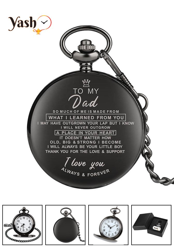 Designed with a timeless black finish, this pocket watch carries a vintage charm that complements any outfit. The engraved heartfelt message on the case makes it even more special—ensuring that every glance at the watch reminds your dad of the love and appreciation you hold for him.